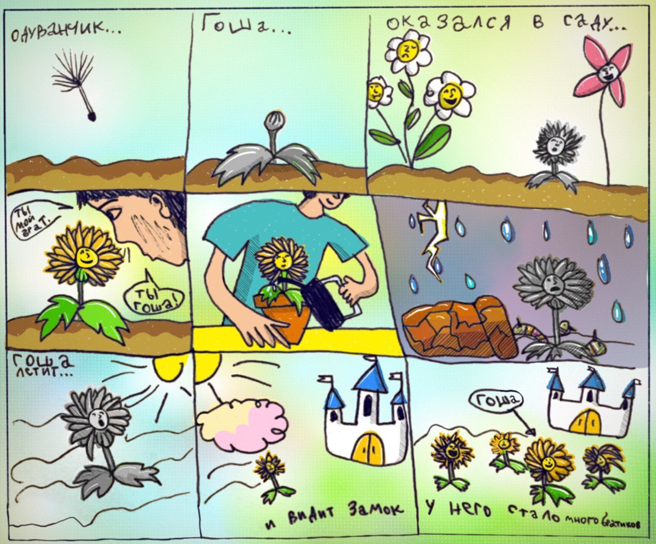 Разрабатываем синопсис (придумываем историю или стихотворение), распределяем сцены героев и фоны по участникам, рисуем эскизы персонажей и окружения
